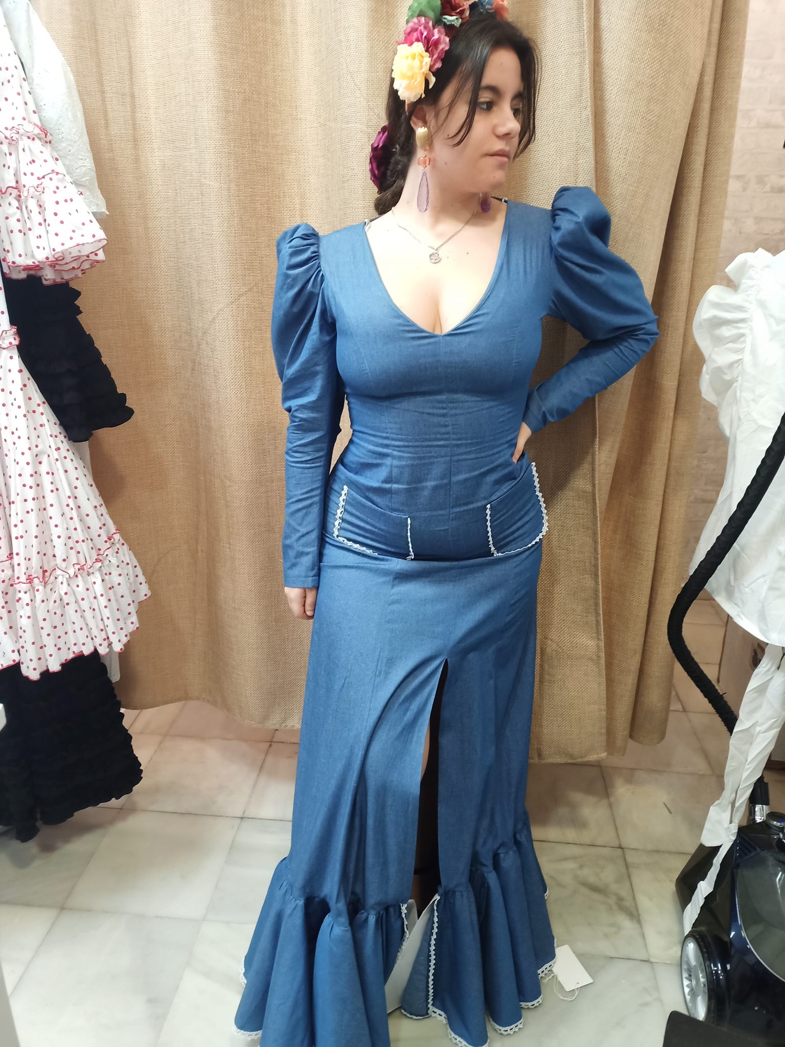 - Perfecta para Cualquier Ocasión: Ya sea que te dirijas a una feria, romería o simplemente desees destacar en cualquier evento flamenco, nuestra Bata Flamenca Nardo en tela vaquera te garantiza un estilo impecable y sofisticado.