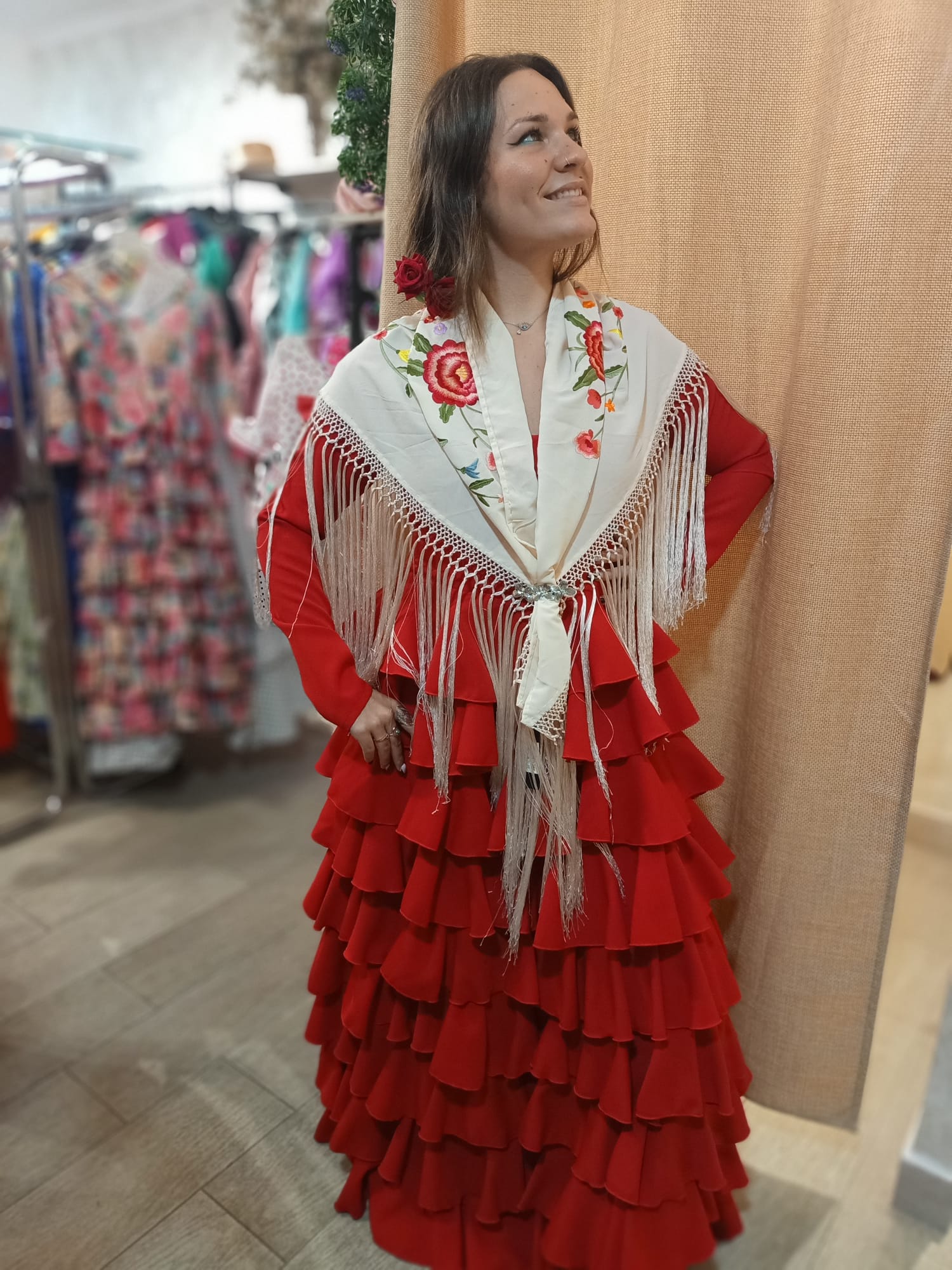 Traje de Flamenca Modelo Maite Confeccionado con múltiples volantes que añaden movimiento y gracia a cada paso, este traje captura la esencia del flamenco con un toque de elegancia y estilo.